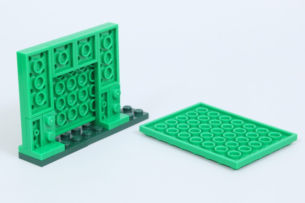 That was when I remembered the narrow bracket elements (first introduced in 21344 The Orient Express Train) and concocted a plan to represent these hedges using simple plates. By attaching these brackets to the plates with two facing one way and two facing the other, I managed to create a sturdy hedge with studs on either side. Those studs add texture but still maintain the uniform appearance that I was aiming for, while also giving the model a lo-fi vintage LEGO charm.