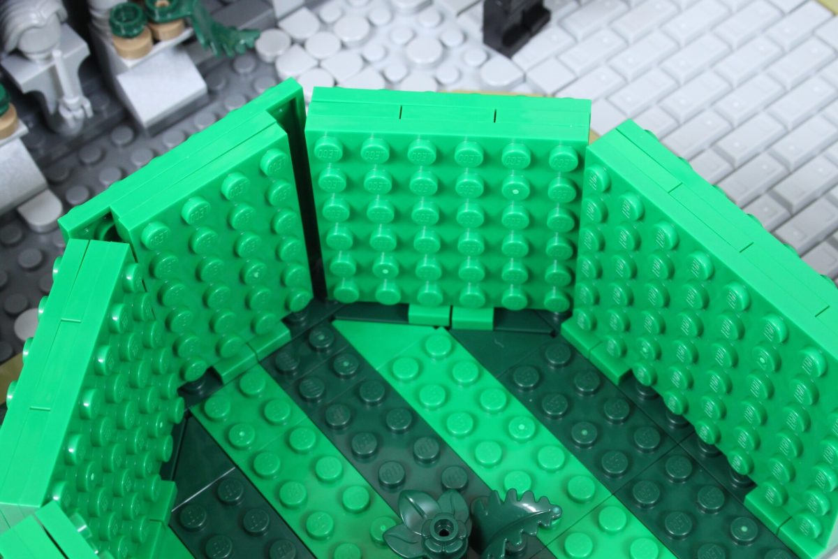 The hedges ended up being one of the most challenging parts of the model. I knew that they had to look uniform, but traditional LEGO foliage elements are anything but. Attempting to combine multiple leaf and branch pieces created a messy assembly that was too fragile to be effective. Looking to JL.Bricks’ build, I noticed they used a combination of bricks and plates on their side, but the design still wasn’t quite uniform enough to be satisfactory.