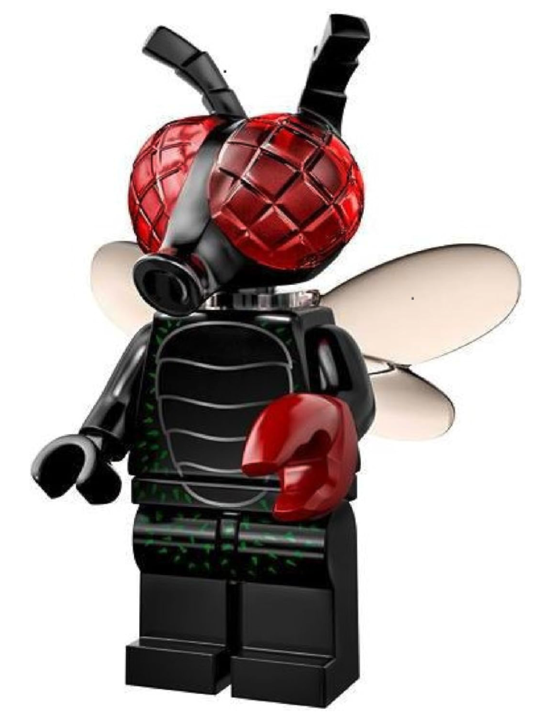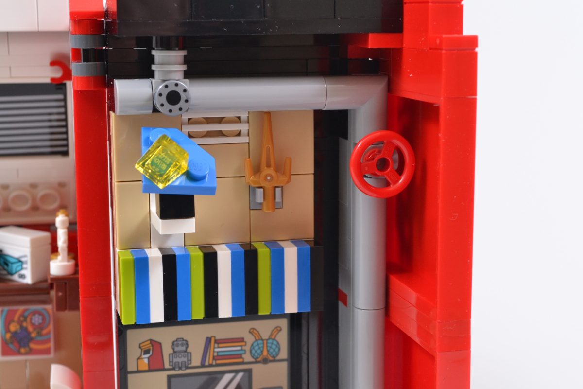Moving down the wall reveals a stickered rear shelf full of geeky goodness, such as another image of a mini arcade machine, a tiny robot similar to the Collectible Minifigure included in 8827 Series 6, and a fly mask that could be a reference to either the now-retired LEGO Insectoids theme or the creepy Fly Monster character that popped up in 71010 Series 14.