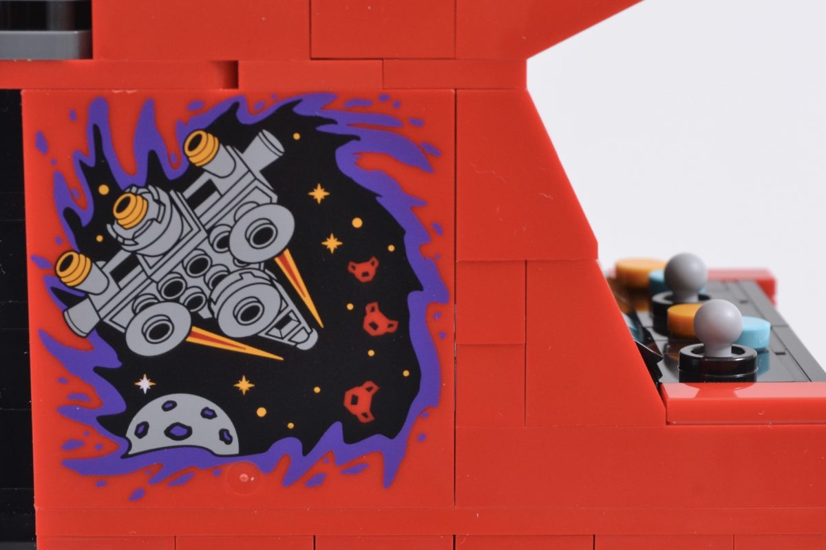 However, instead of licensing an existing retro title such as Space Invaders, Defender or Asteroids for its exterior monitor screen and printed side elements, 40805 Arcade Machine instead opts for its own take on the video game genre, one that more closely mimics such hits of yesteryear as Galaga and Gorf.