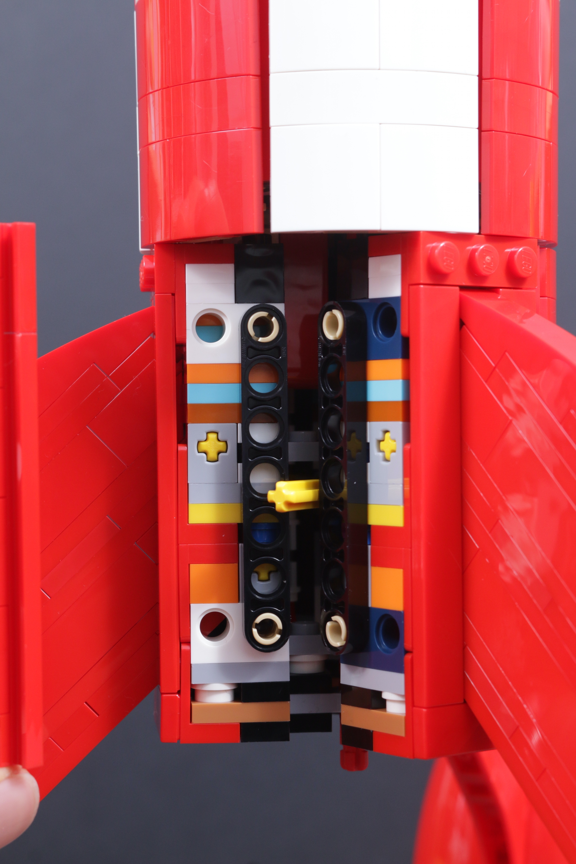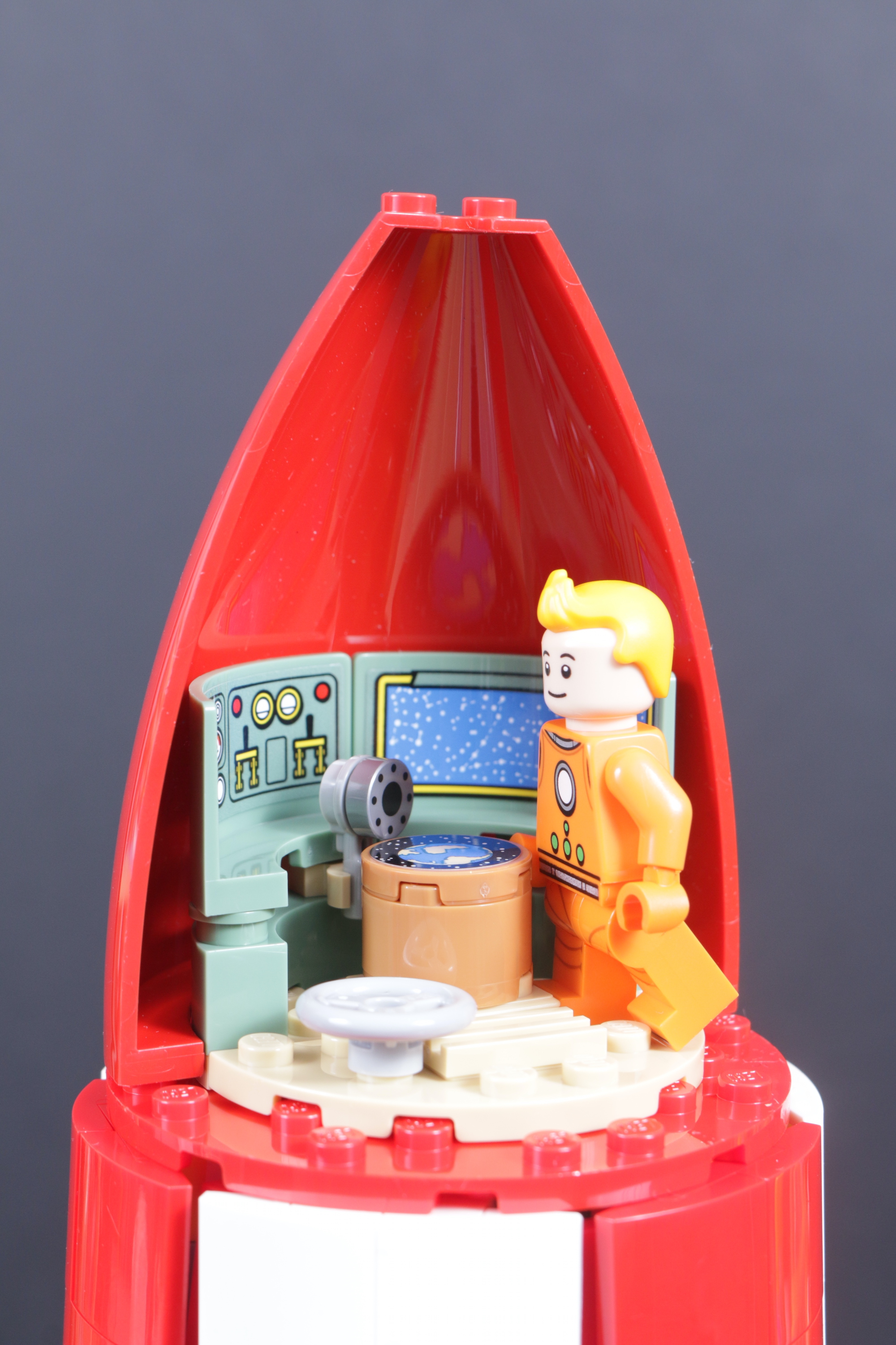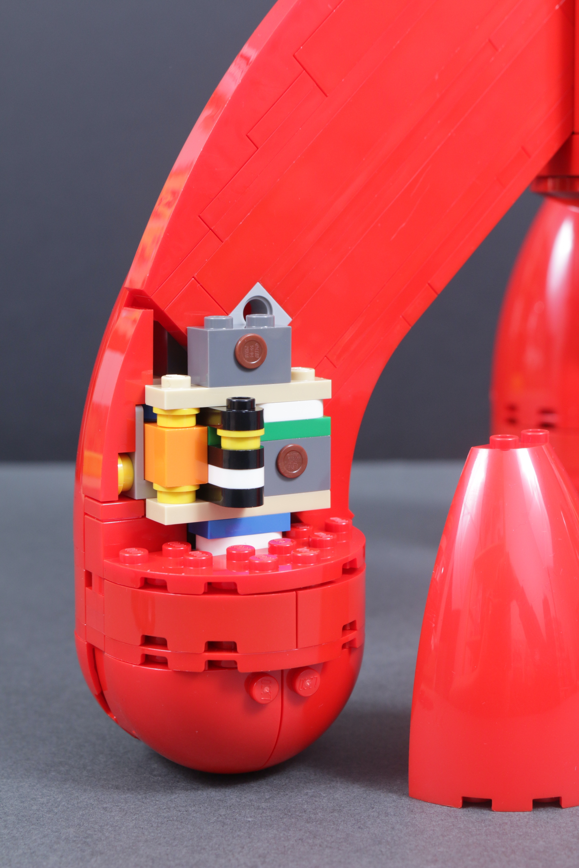 Most importantly, for those of us who pretend we’re not going to be playing with this, it also looks mighty on display. The scaled-down approach from the original submission is generally wise. While it’s likely also a contributing factor to why the expanding curvature effect of the body of the rocket is a little too subtle to be as effective as the technique behind it deserves, this roughly half-size approach allows for enough detail and shaping in every other aspect of the design, and makes for a final model that is imposing, eye-catching and practical to actually put on display somewhere. It’s modest and impressive at the same time, which feels most appropriate whilst also keeping the total price of the set to a more reasonable mid-range.