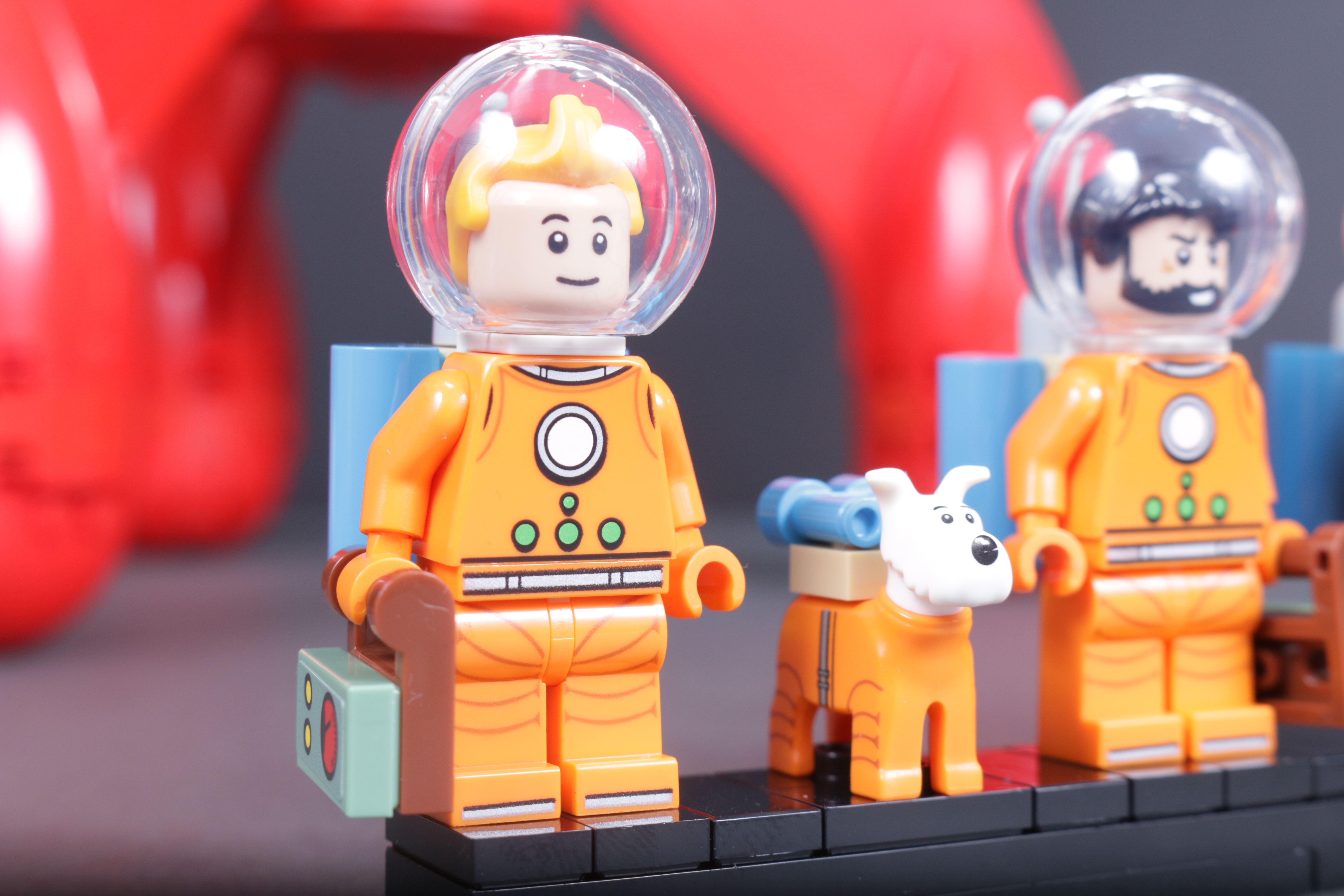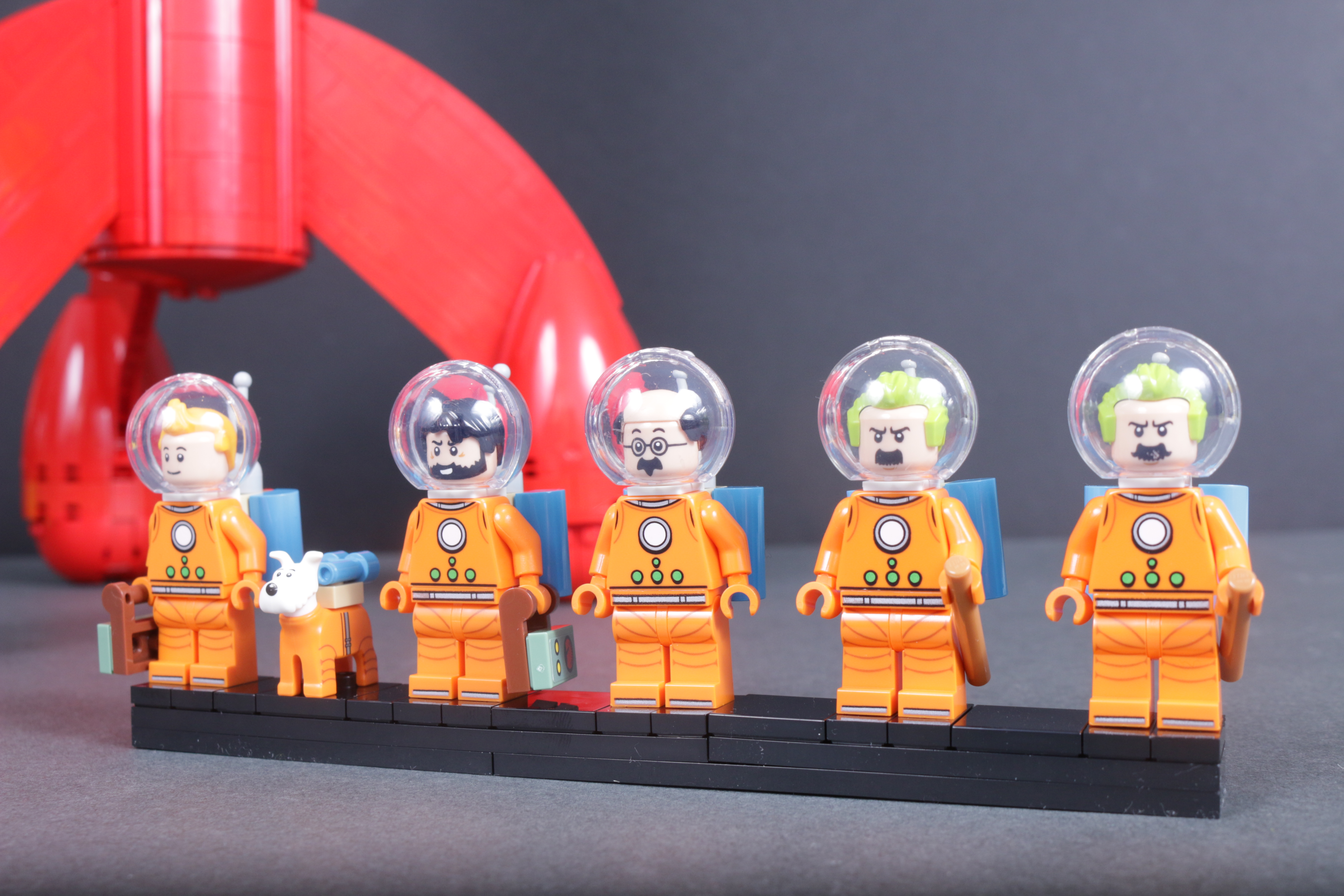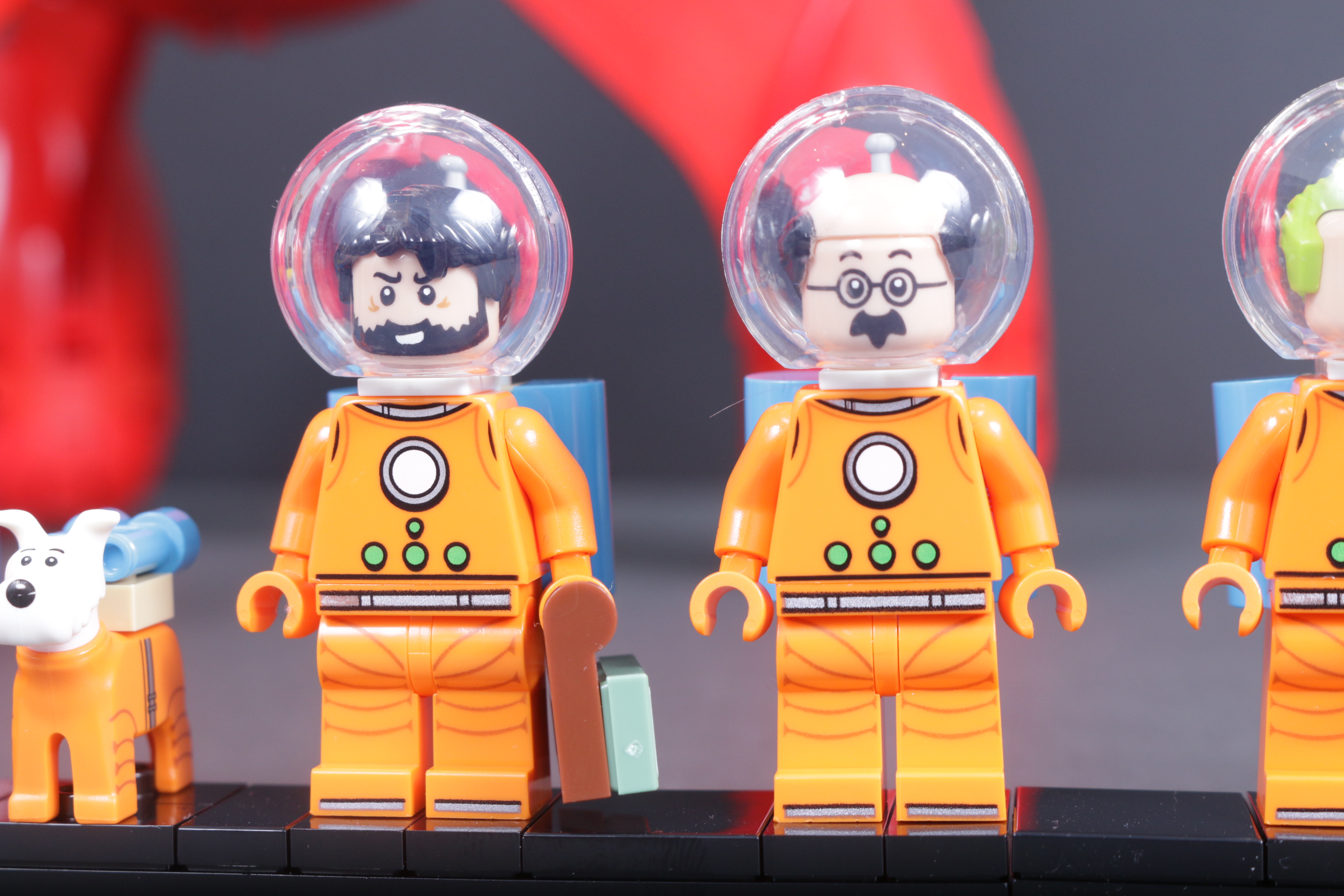 As mentioned up top, though, and certainly reflected in the box art for the set, one of the key draws to 21367 Tintin Moon Rocket will be that line-up of exclusive minifigures. There are no antagonists included, but we get the core cast of Tintin, Snowy, Captain Haddock, Professor Calculus, Thomson and Thompson, and they are each expertly designed in a way that marries LEGO charm with Hergé’s particular art style in character design. That is to say, the faces and expressions are spot on, as are the designs for their space suits.