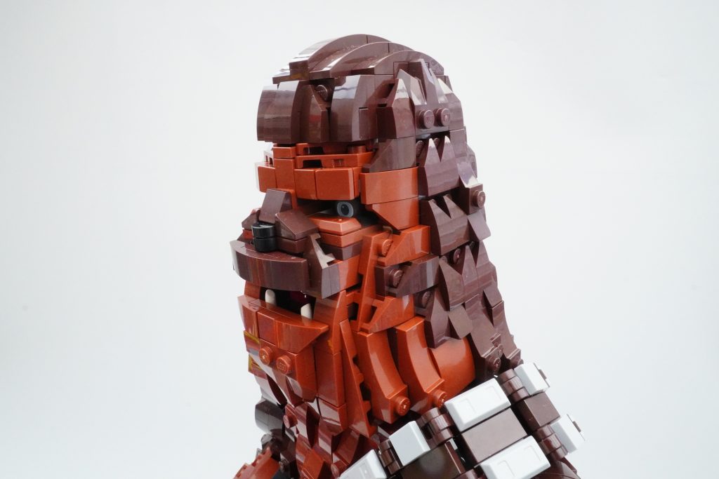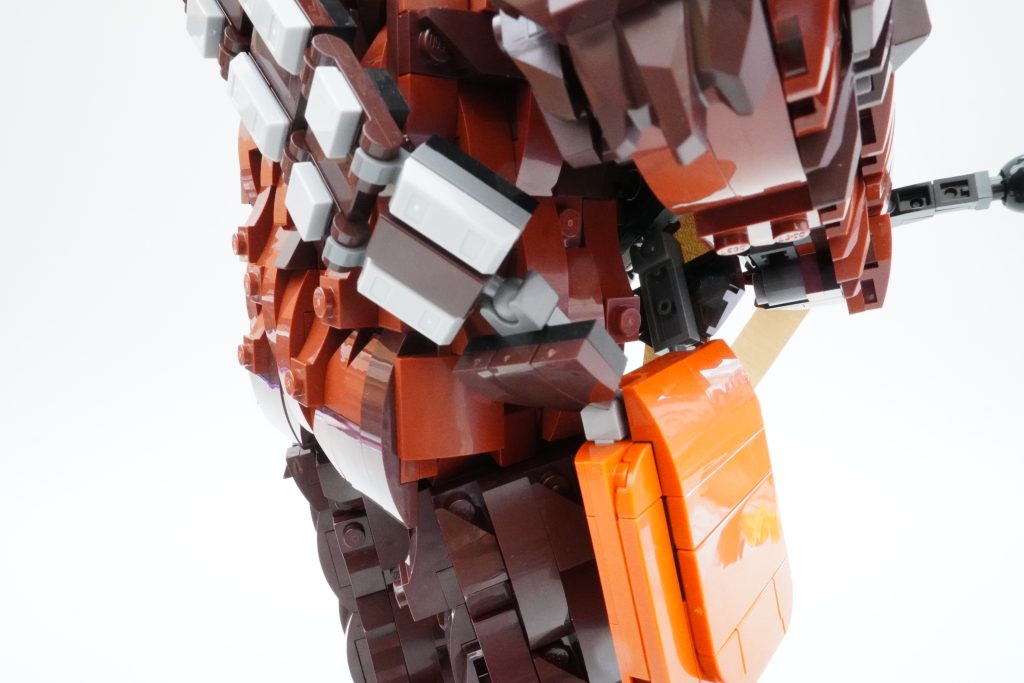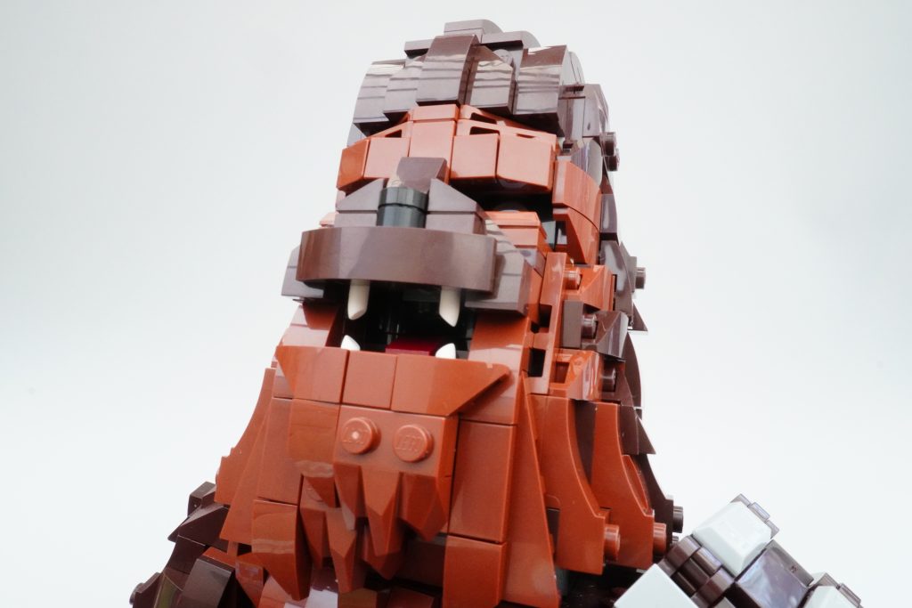 First things first: the face. It’s difficult to ignore the fact that 75371 Chewbacca is uncomfortable to look at. There’s just something about his too-human eyes, paired with his bright, long, fiercely-bared teeth, that make the set less appealing than previous similar brick-built Star Wars characters.