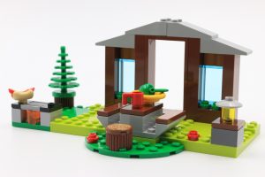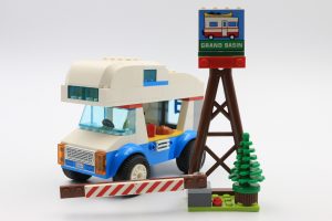 As an environment, the little park is quite basic but does tie in with the film. The signpost has a printed brick that may prove useful for holiday builds and the A-mast lattice appears in reddish brown for the first time. All of the camping features of the park are simple designs but they work effectively, particularly the bench which is made from brown tiles attached onto a grey 4×6 inverted roof brick.