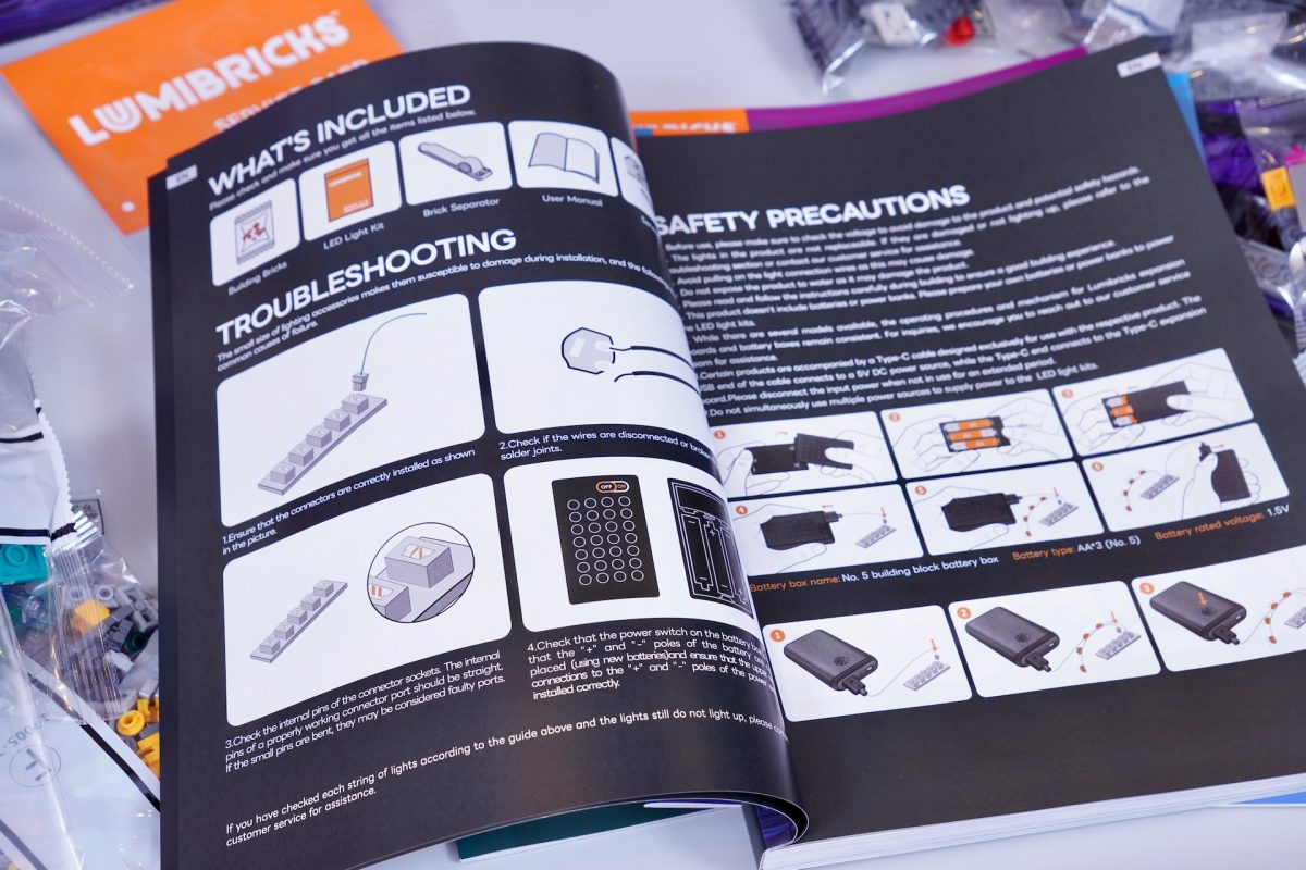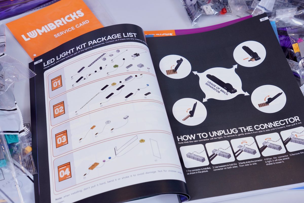 Then there’s a detailed breakdown of everything inside the various packets of lighting components, which are nestled inside the separate cardboard box mentioned earlier, a guide to using the included brick separator and a four-step guide to removing wires from the connector using a pair of included tweezers.